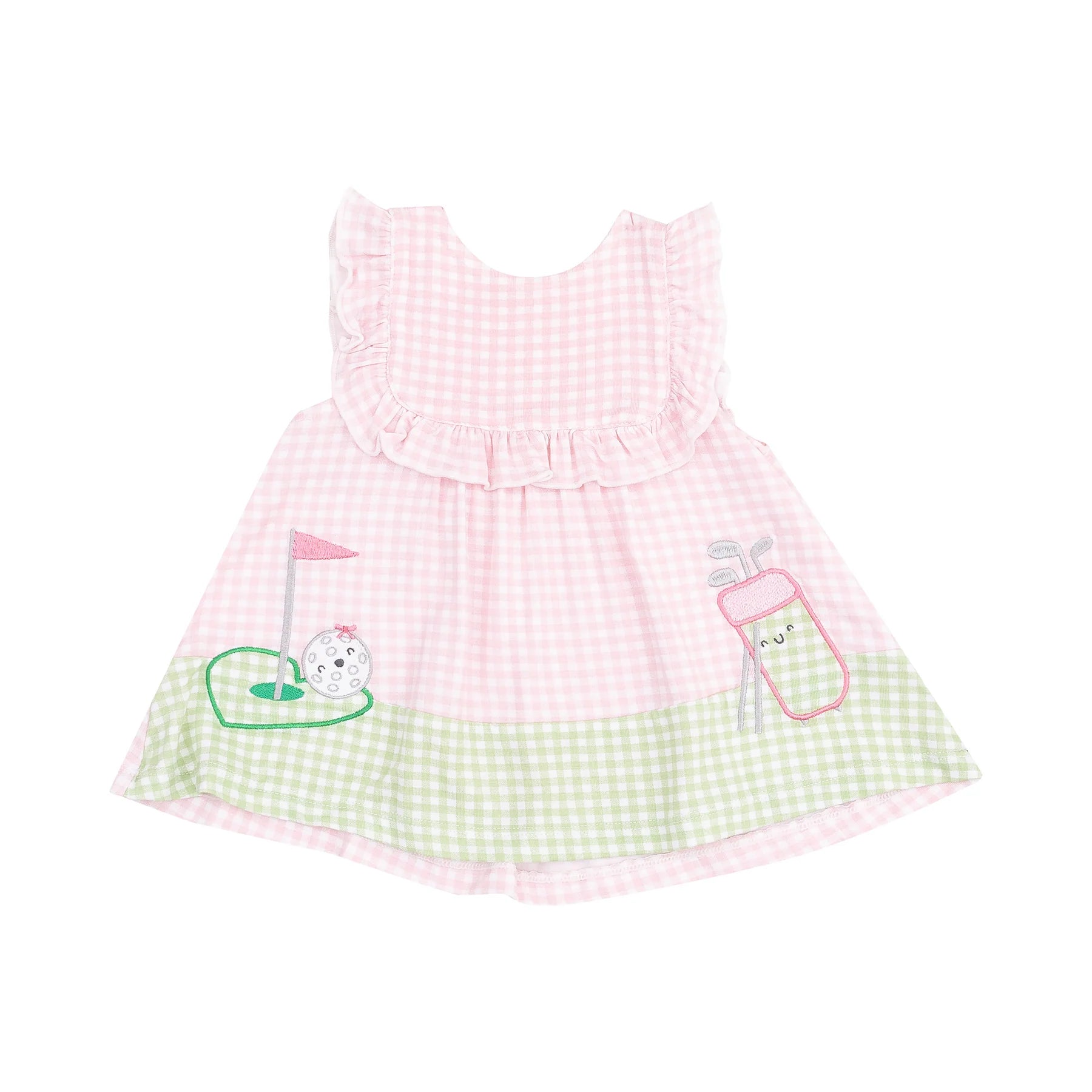 Your little one is ready for a day of play and fun in this adorable Ruffle Top and Bloomer Set! Made with a sweet pink and green mini gingham print, this set is perfect for those cute and comfy days filled with sunshine and smiles. The top features a charming golf-themed applique with a putting green and golf bag, adding a fun twist to any outing!