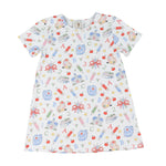 This t-shirt style dress is perfect for the first day of school! Features an adorable all-over-print of letters, numbers, pencils, backpacks, books and more!