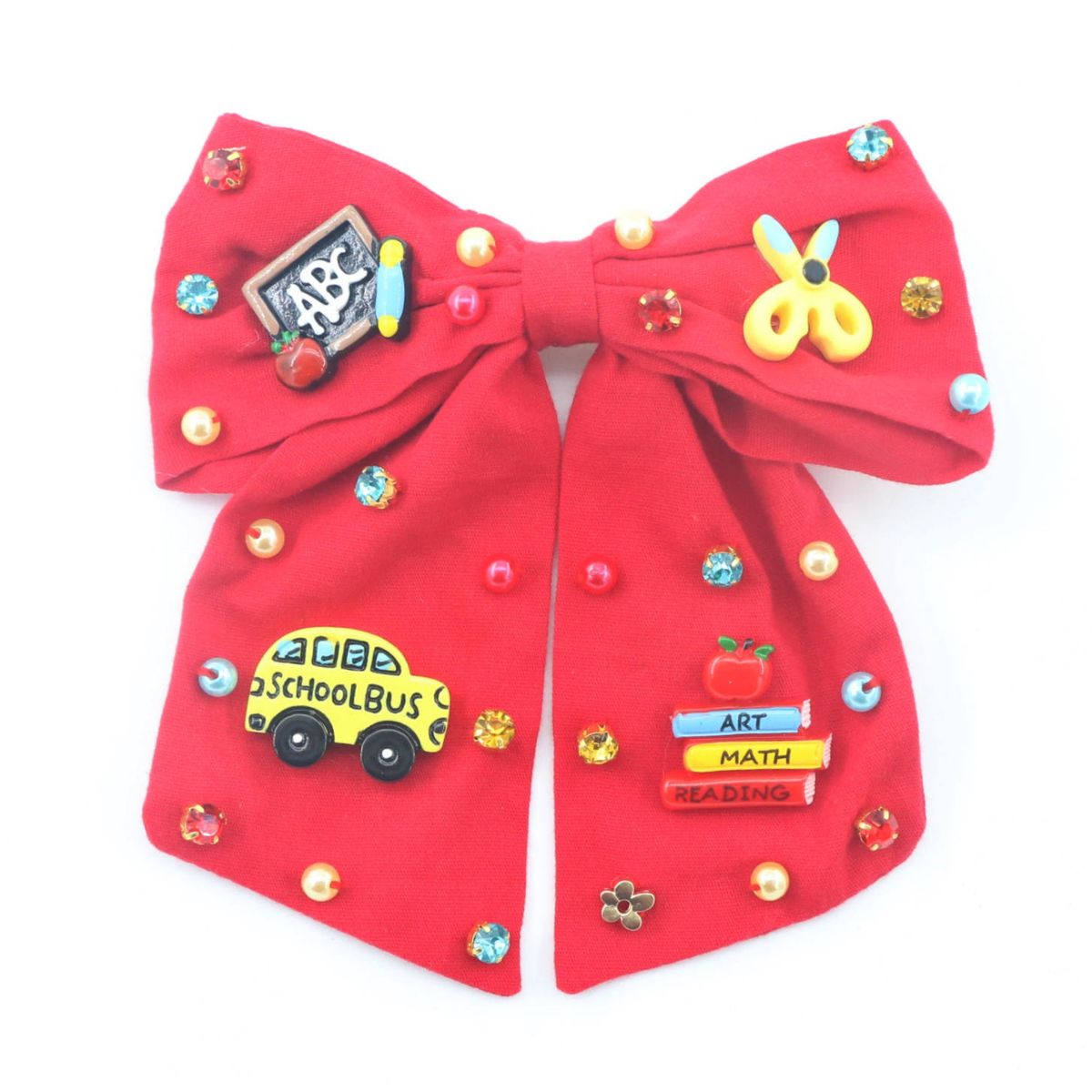 We are excited to introduce the jumbo Back to School Bow. This new bow features adorable 3d back to school charms, sparkly beads, and shiny pearls throughout. Perfect for bow-loving littles who adore adding a touch of whimsy to their style. Crafted with care, this accessory embodies the playful elegance and attention to detail that Poppyland values. Elevate your little one's accessory game with this enchanting piece today!
