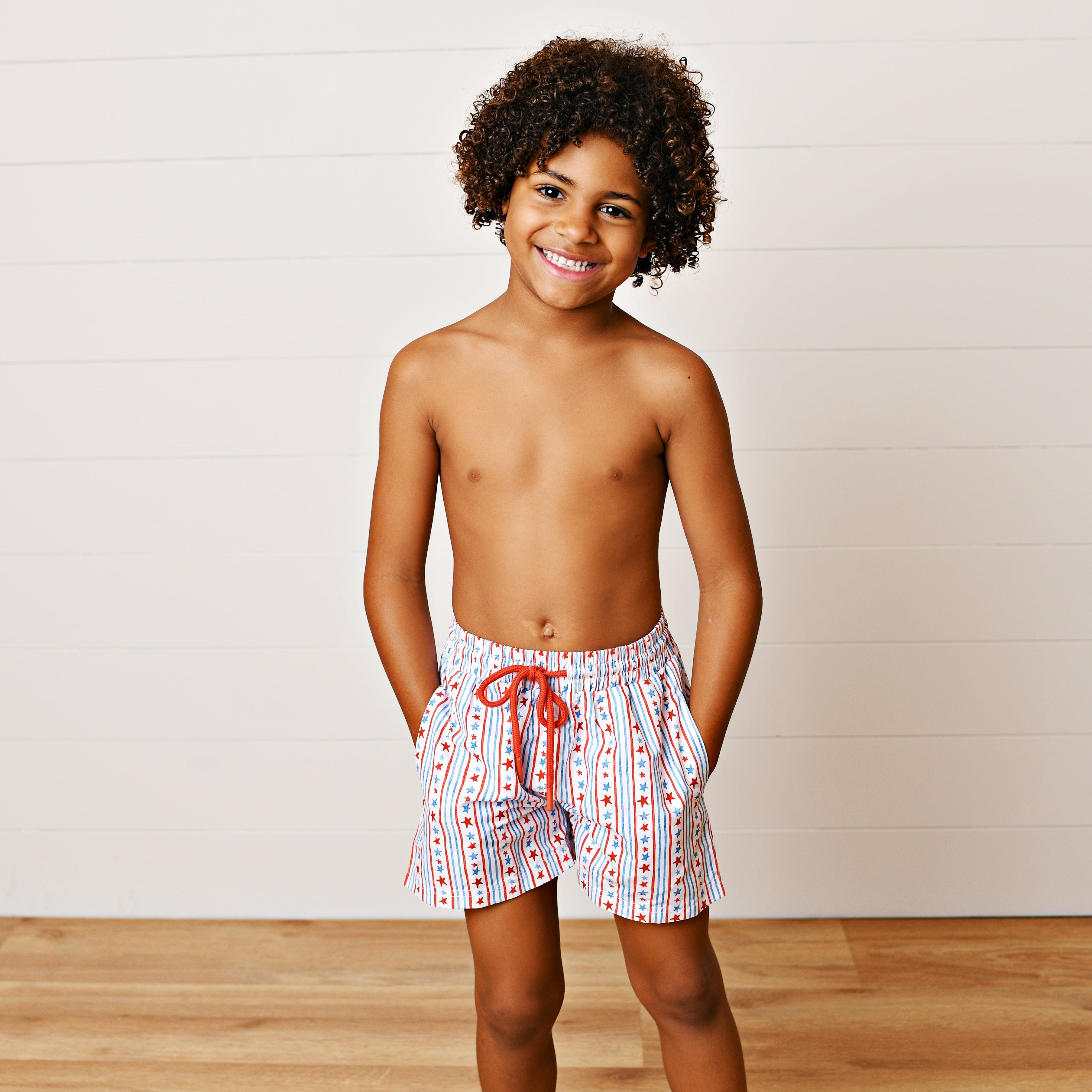 Quincy Mae Boys Swim Short Blue + Butterscotch Stripe