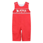 Elevate your little one's Christmas style with charming overalls featuring sweet smocking on the chest and embroidered Santa and his sleigh. Embrace the festive spirit with this delightful ensemble, perfect for creating cherished holiday memories. Snaps at the crotch make sure diaper changes will be a breeze and made in 100% soft cotton to ensure he is comfortable all day long. The perfect look for creating cherished holiday memories.