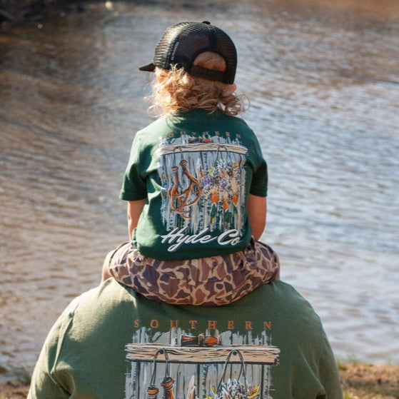 Racks and Quacks is printed on Forest Green. All our items are Direct to Film printed. All our infant/toddler/ youth tees are printed on 100% Cotton tees, brand Rabbit Skins/LAT. Our adult tees are printed on 100% Cotton, brand LAT. For long lasting, Wash on Cold, inside out and tumble dry on low.
