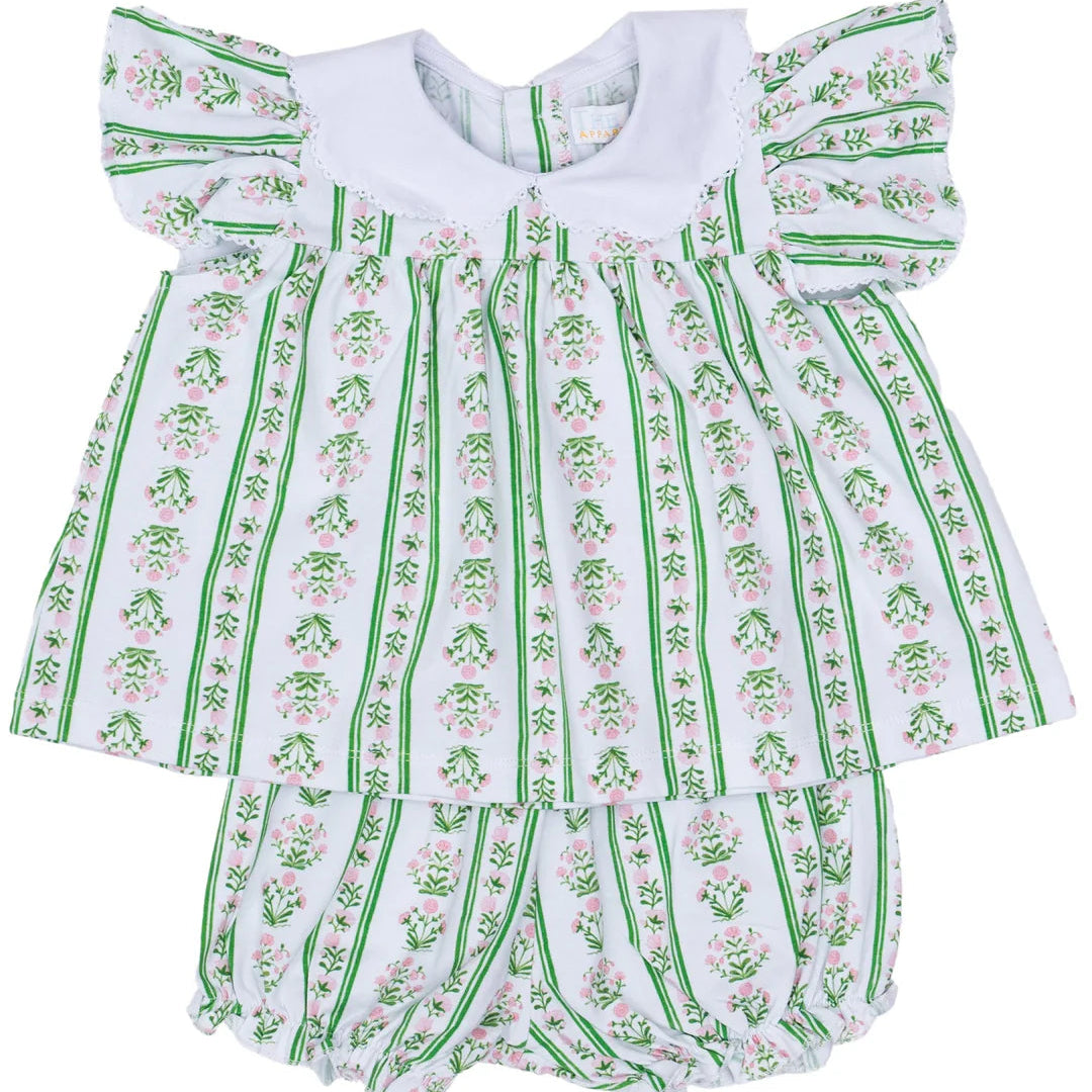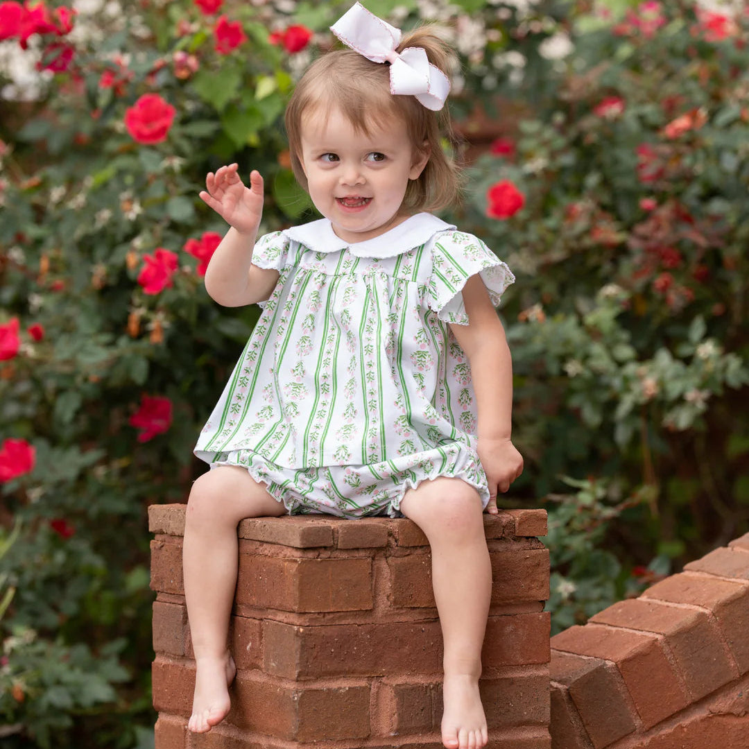 This sweet bloomer set is made of the softest pima cotton, featuring a charming green and pink floral print that captures effortless elegance. The signature scallop moonstitch collar adds a refined, whimsical touch perfect for little ones who love timeless style.