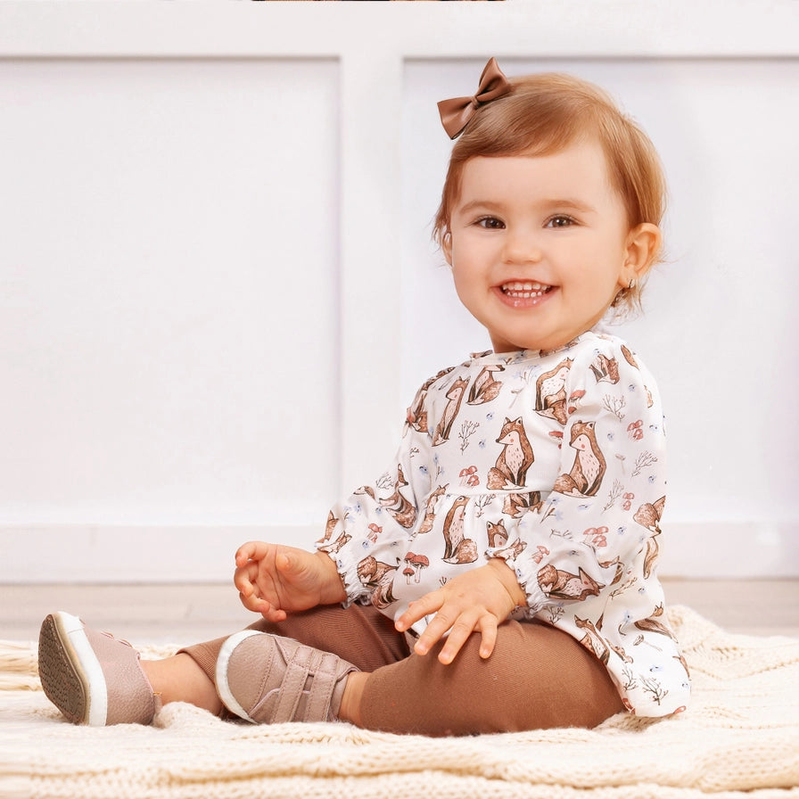 This charming baby set features a sweet woodland fox and floral print top made from an ultra-soft bamboo, cotton, and spandex blend. Naturally breathable, hypoallergenic, and eco-friendly, the bamboo jersey offers all-day comfort and gentle care for delicate skin. Ruffle-cuffed sleeves and back buttons add extra style and easy dressing, while the ribbed cotton leggings feature a stretchy elastic waistband for a snug yet comfy fit. Perfect for forest-themed playdates, seasonal strolls, or everyday coziness.