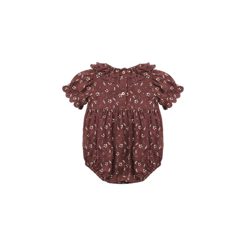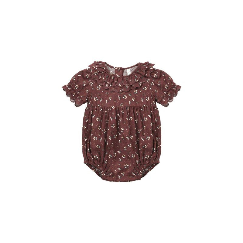 Features elastic cap sleeve, flamboyant ruffle collar, and snaps on the bottom for easy changes!