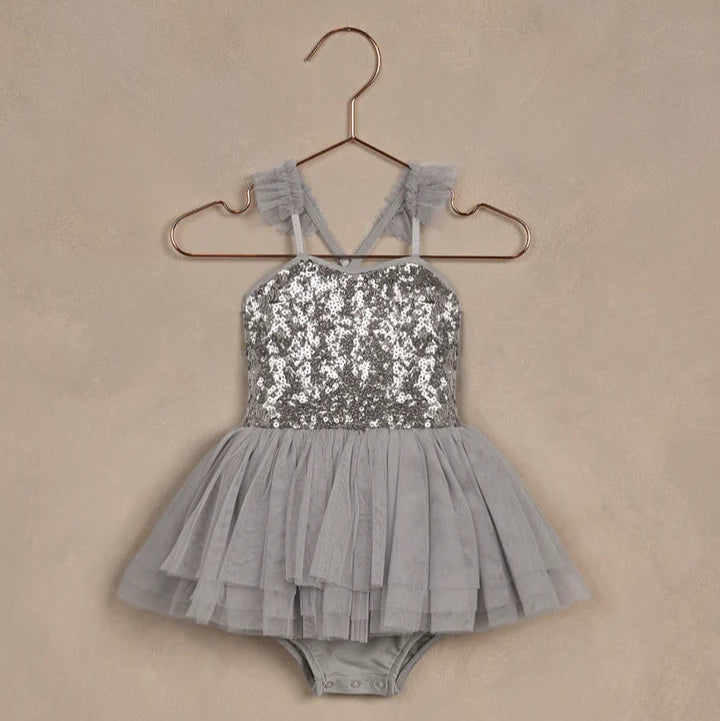 Our Clementine Tutu features a shimmery soft leotard adorned in faceted sequin, a full tiered tulle skirt, and adjustable ruffle shoulder straps.