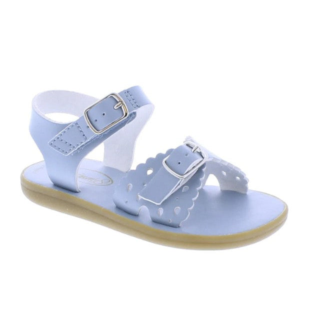 Open-toe, open-heel microfiber sandal featuring true-buckle forefoot strap with decorative tear-drop perf design and hook-and-loop ankle strap with decorative buckle.