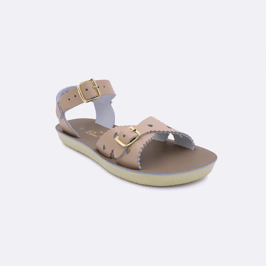 The Sun-San Sweetheart is a pretty sandal with heart-shape cutouts and scalloped edges. It’s fully adjustable with a buckled toe and ankle straps. As seen on many celebrities’ kids, the Sweetheart is a popular choice. The combination of comfort, durability and fashion make these a wear-anywhere sandal.