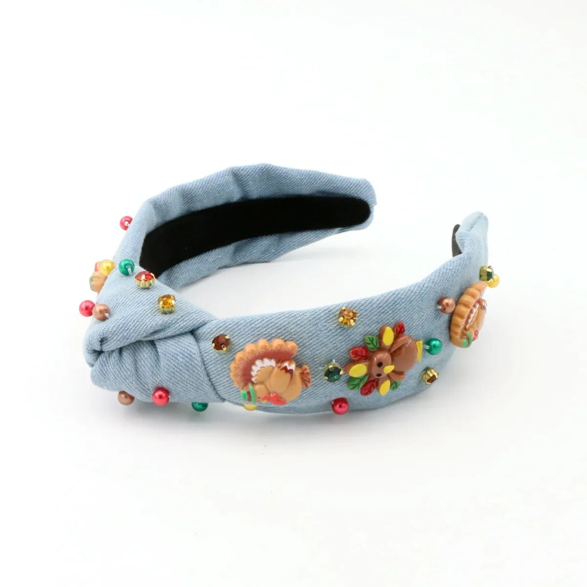 This festive Thanksgiving inspired headband features a denim base, quirky character charms, shiny beads, and sparkling stones throughout! At Poppyland, we create accessories that make every moment special! Allow your little to express her individuality in this gorgeous statement accessory.