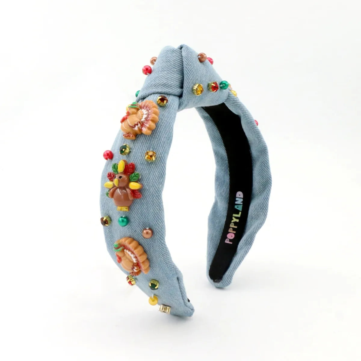 This festive Thanksgiving inspired headband features a denim base, quirky character charms, shiny beads, and sparkling stones throughout! At Poppyland, we create accessories that make every moment special! Allow your little to express her individuality in this gorgeous statement accessory.