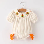 Celebrate the season in style with this adorable baby girls romper featuring apricot plaid fabric and charming turkey embroidery. The delicate smocking adds a classic touch, making it perfect for Thanksgiving gatherings. Soft and comfortable, this romper keeps your little one cozy while looking festive and cute. Ideal for capturing memorable holiday photos and creating lasting family moments.