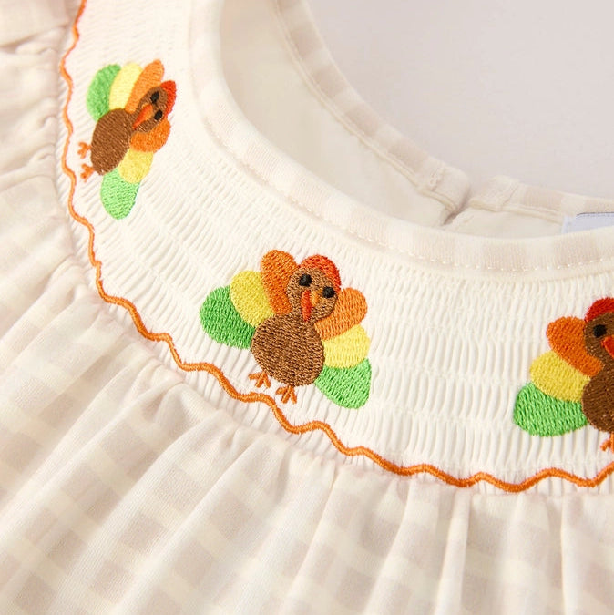 Rylee Faith Fall Thanksgiving Plaid Turkey Smocked Bubble Oatmeal