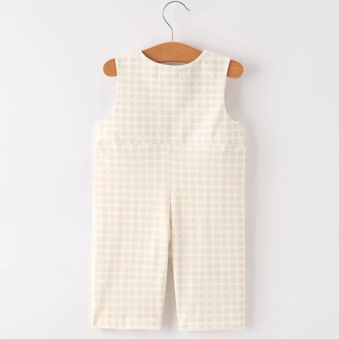 Celebrate the season in style with this Fall Thanksgiving Apricot Plaid Boys Romper. Featuring charming turkey embroidery and delicate smocking, it combines festive detail with cozy comfort. The warm apricot plaid pattern adds a seasonal touch perfect for holiday gatherings, making it an ideal outfit for your little one to shine during Thanksgiving celebrations.