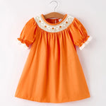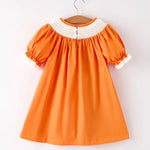Celebrate the season in style with this charming orange pumpkin smock dress, perfect for Thanksgiving and Halloween. Featuring delicate embroidery and lace details, it adds a festive touch to your baby girl's wardrobe. Comfortable and adorable, this dress makes every autumn moment memorable.
