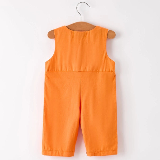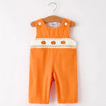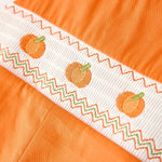 Dress your baby boy in festive charm with this orange pumpkin smock romper, perfect for Fall, Thanksgiving, and Halloween celebrations. The intricate embroidery adds a delightful touch, while the soft fabric ensures comfort throughout the day. This romper combines seasonal style with cozy wearability, making it an ideal choice for holiday photos and family gatherings. Give your little one a standout look that captures the spirit of the season.
