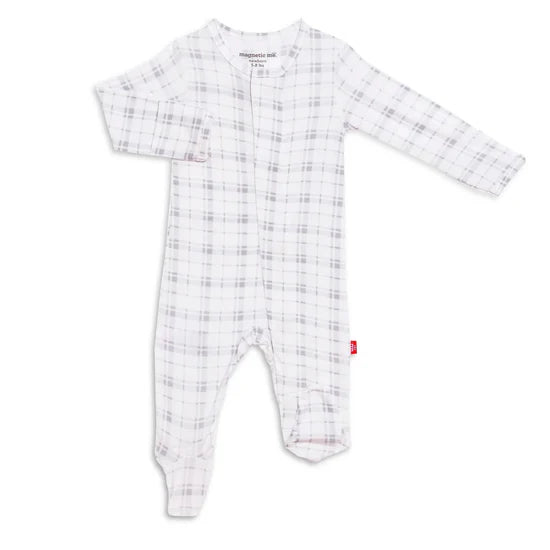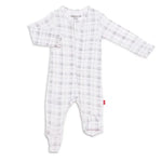 A soft, stylish all-day and all-night wardrobe staple with smart magnetic fasteners that makes changing time painless. With our no over-the-head design, simply open the outfit, insert baby, and BOOM, DONE! - the footie practically closes itself. Machine wash as directed.