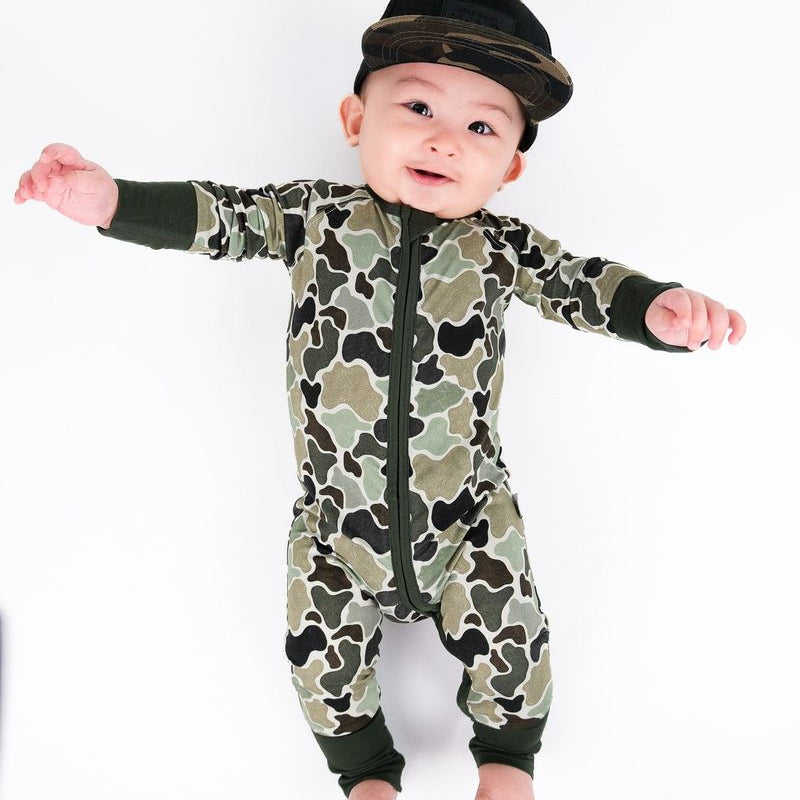 A Camouflage Classic: invisible since forever. Some might even call it the O.G. disappearing act or the original Hide and Seek, "now you see me... actually, you don't!". This camouflage is a classic outdoor camo print designed to keep your babe feeling hidden and winning during any mountain, fishing, camping or forest adventure. Camp incognito with animal tree friends or blend in with the frogs by the pond! Camouflage is key!