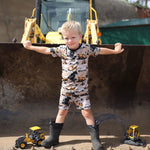 This print features a pattern of various construction vehicles in a neutral beige/ tan background. Our design includes: mobile cranes with extendable booms, utility trucks with bucket lifts/ cherry pickers, bulldozers/ excavators with forklifts, and multiple kinds of pickup trucks. Truck obsessed boys and girls will love this print in a bamboo pj set or convertible footie pajamas. Get constructive in this print from our Core Collection - a perfectly engaging design for little ones just beginning to recognize and identify different types of construction trucks and vehicles.