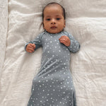 No knotting needed. – we're all about easy. Keep your tiniest tucked in with our extra-long take on the traditional baby gown with easy-access DIAPER-ZiP. The easiest changes and silky soft bamboo fabric means more coziness for them. One size fits NB to 3M.
