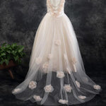 This is an amazing choice for the flower girl in your wedding! This gorgeous dress features tulle rosettes along the neckline and train as well as a removable pearl chain that cascades along the back.