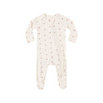 Full double-zip footie crafted from our soft and stretchy bamboo fabric. Fold-over hand mitts included on sizes NB – 3-6M. Raised screen print on soles of size 6-12M for added traction.