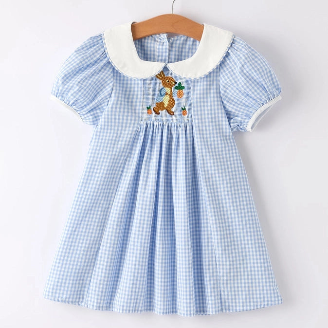 Rylee Faith Blue Plaid Rabbit Embroidered Dress