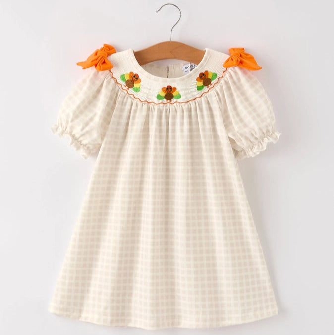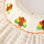 Rylee Faith Fall Thanksgiving Plaid Turkey Smocked Dress Oatmeal