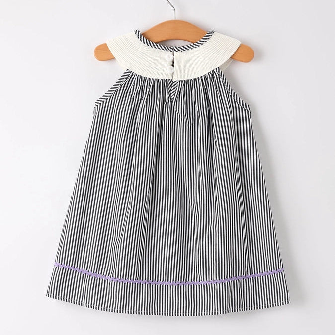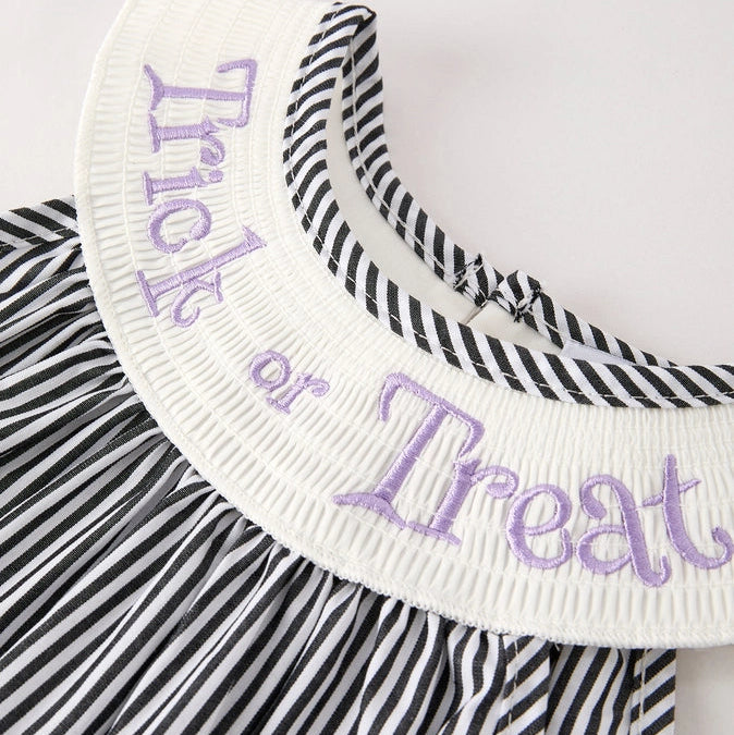Celebrate Halloween in style with this adorable striped smock dress, embroidered with a festive "Trick Or Treat" message. Designed for baby girls, it combines comfort and charm, making it perfect for holiday photos and parties. The soft fabric ensures all-day coziness, while the playful design adds a touch of seasonal fun to your little one’s wardrobe. Make this Halloween unforgettable with a dress that’s as cute as it is festive.