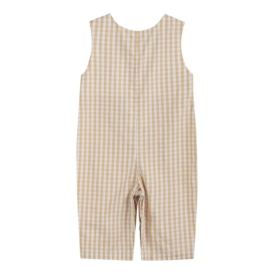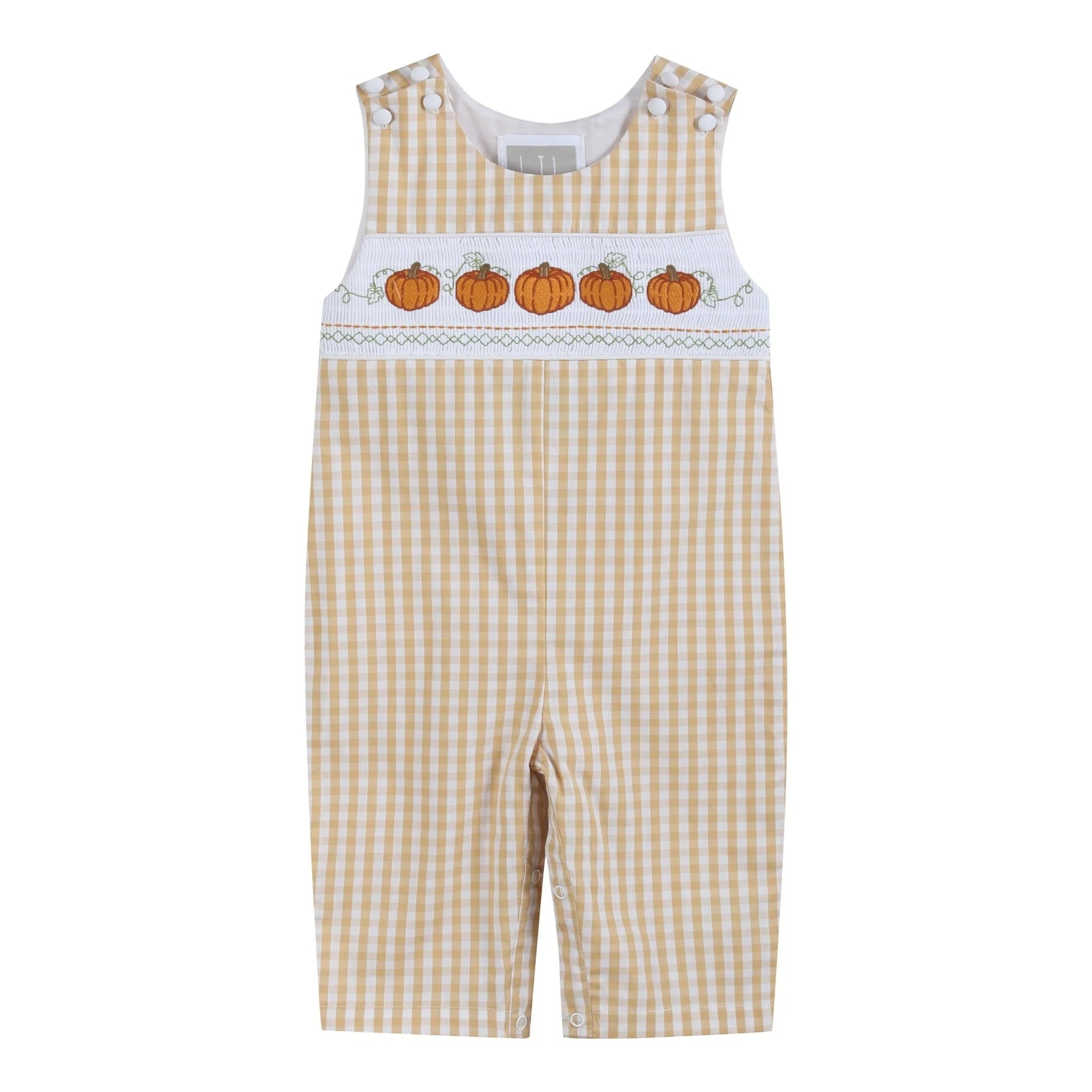 These Light Brown Gingham Pumpkin Vine Overalls are a charming choice for your little boy this Fall season. Detailed with smocking at the chest with adorable pumpkin embroidery. Buttons at the shoulder ensure adjustable sizing, while snap enclosures make diaper changes quick and easy. Perfect for Thanksgiving gatherings, family photos, and visits to the pumpkin patch. These overalls will keep your little turkey cozy and stylish all season long.