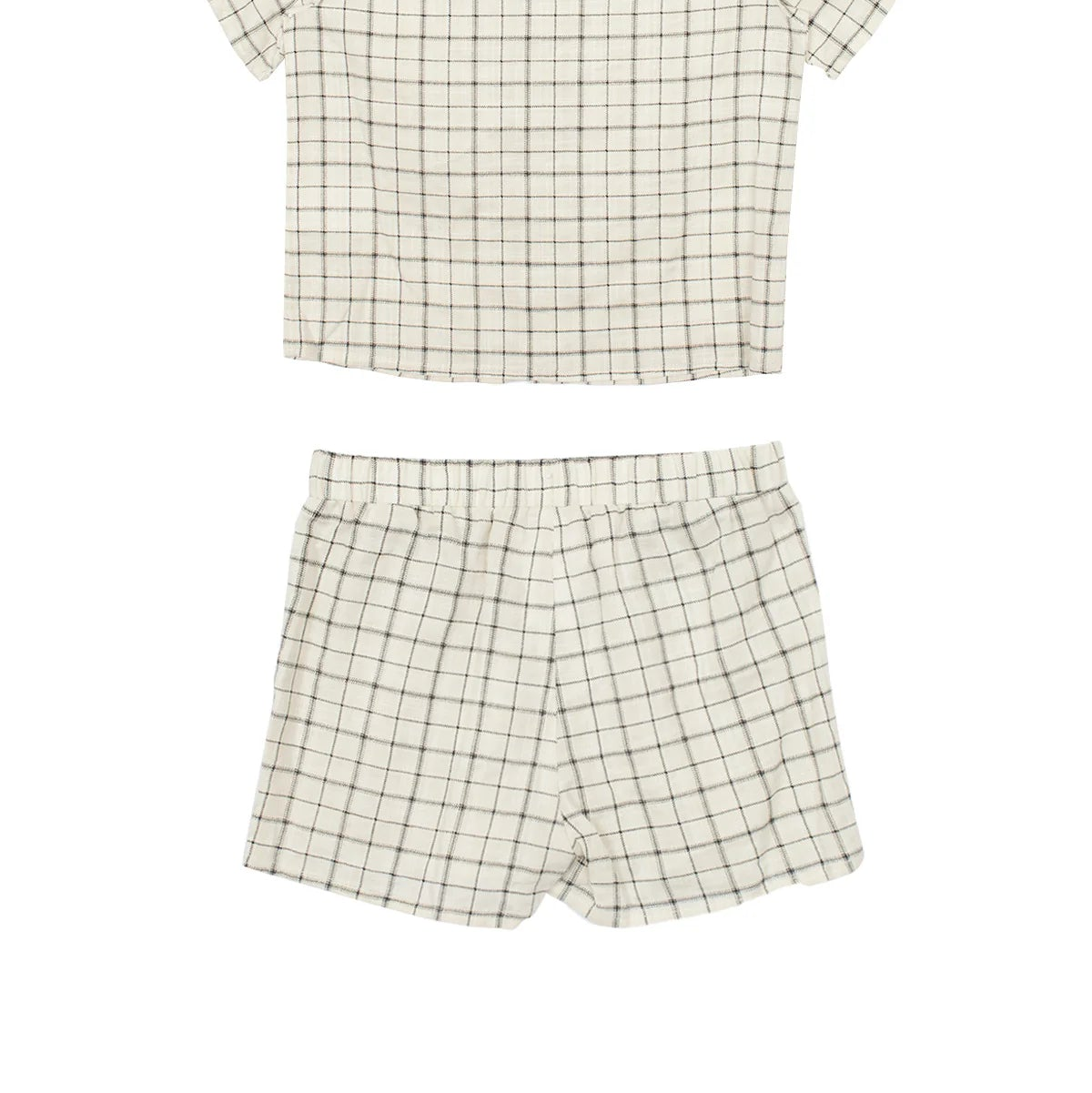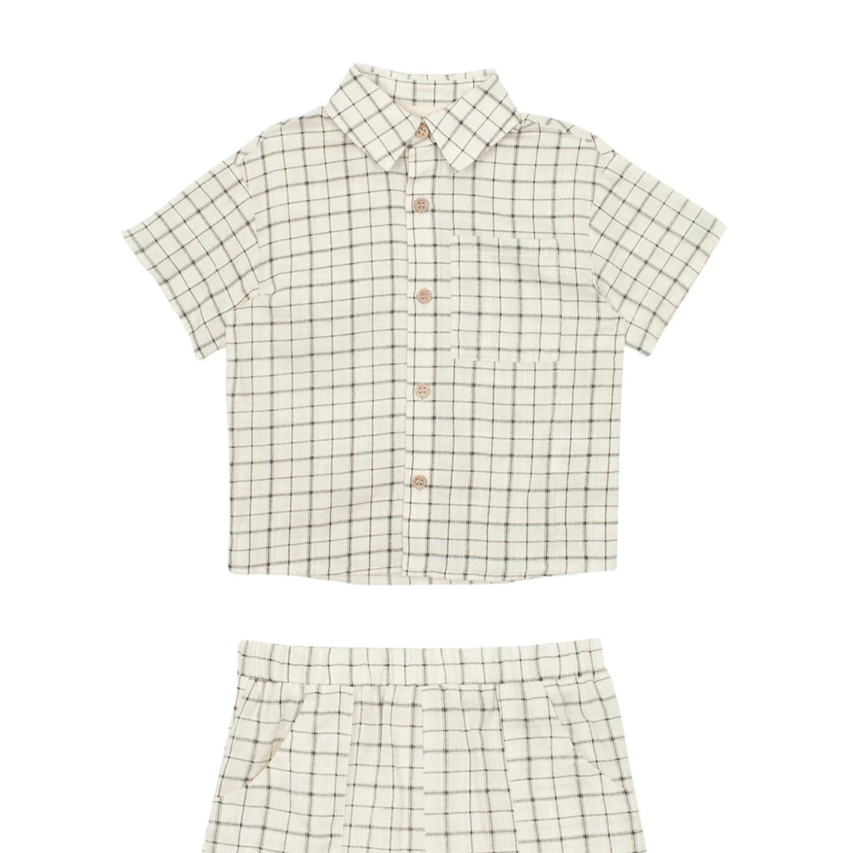 This boys' two-piece set features a short-sleeve button-up shirt and coordinating shorts in a refined ivory and black grid pattern. The top includes a structured collar, front pocket, and wooden buttons for a classic touch. The relaxed-fit shorts offer an elastic waistband and side pockets, ensuring style and comfort all day long.