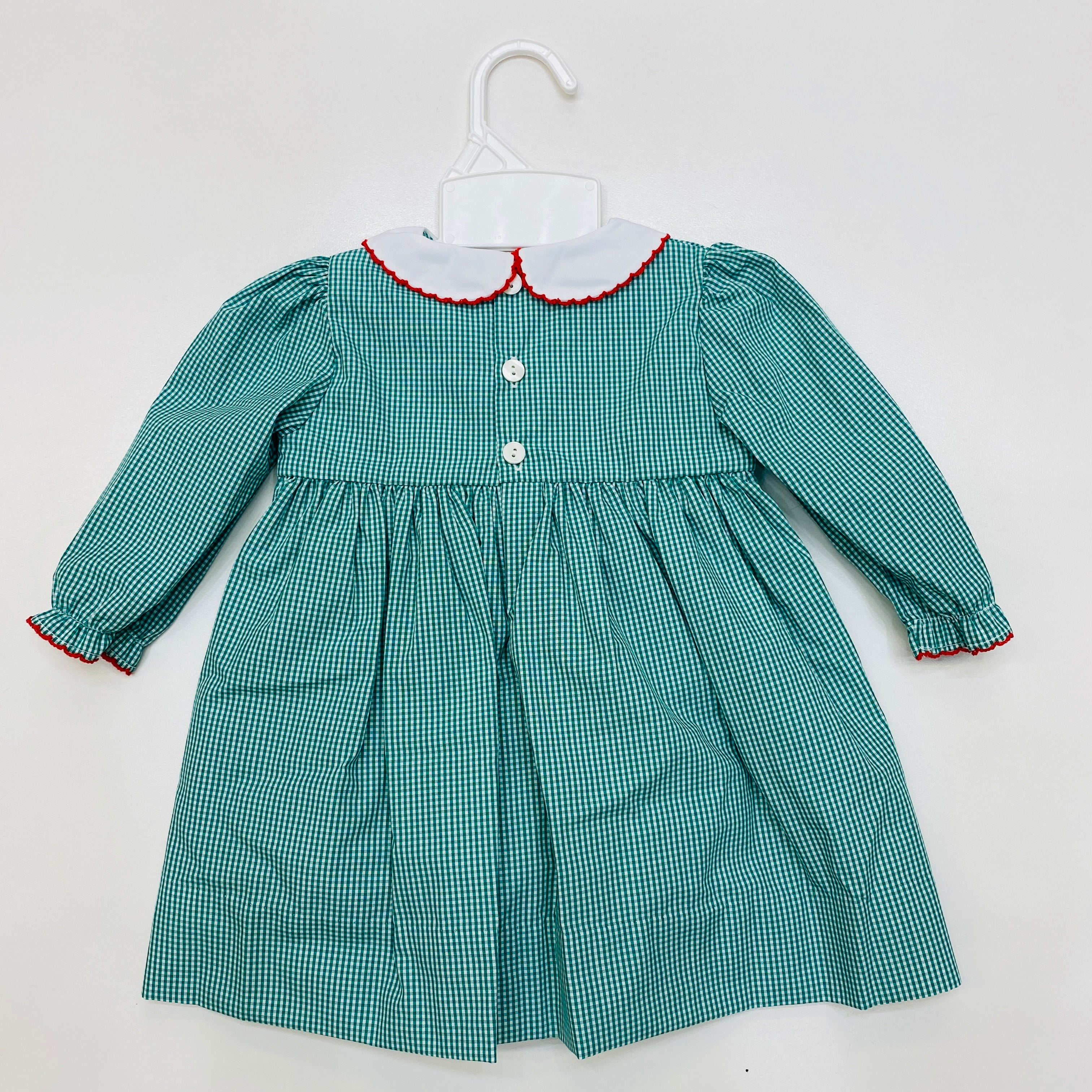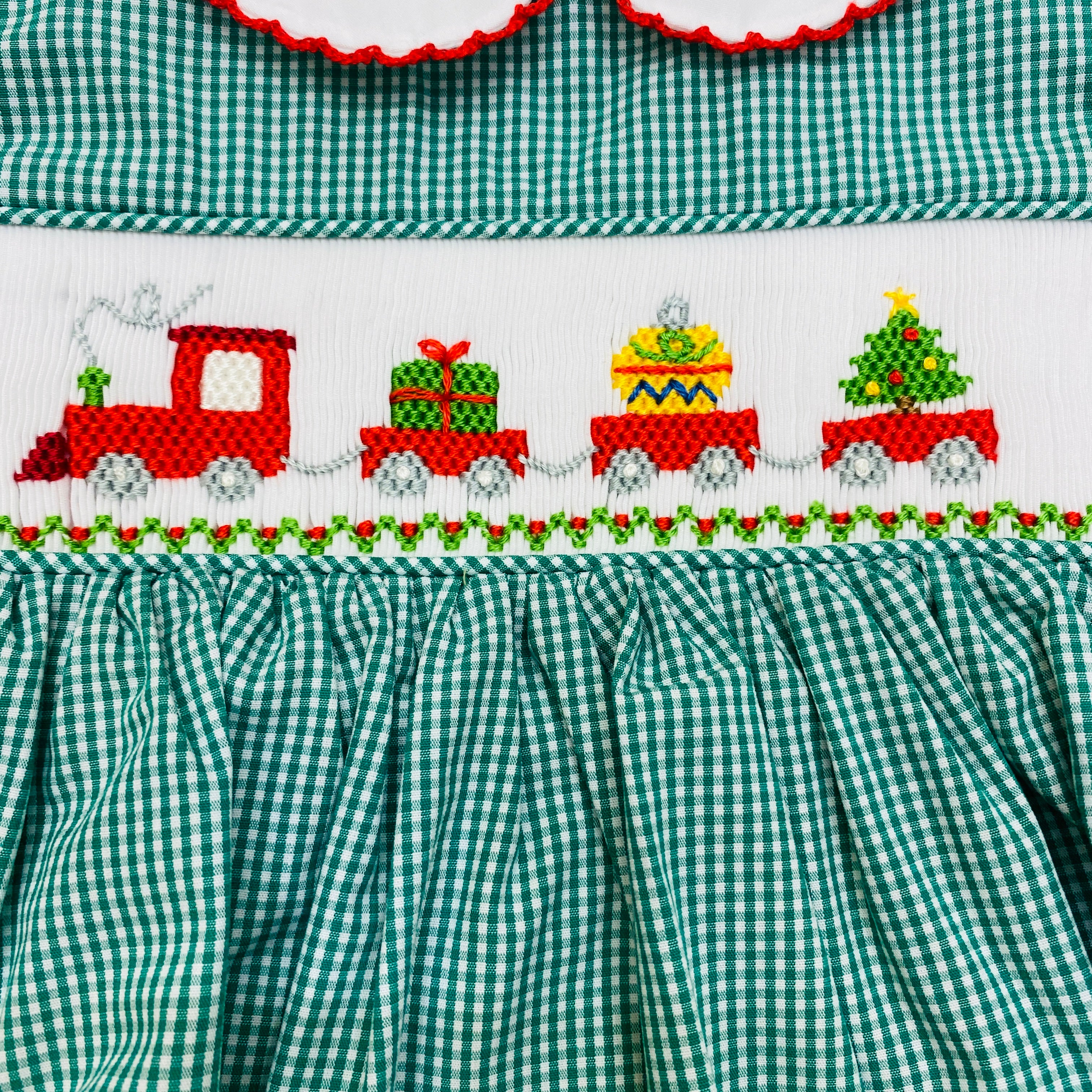 Petit Ami Green Gingham Smocked Christmas Train Dress