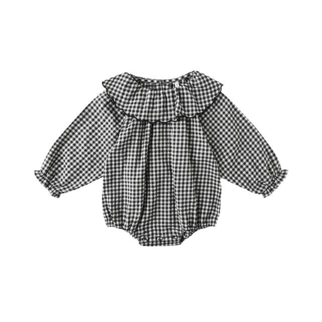 Our Colette Romper features a scalloped collar and gathered sleeves for a darling look, with bottom snaps for easy changes.