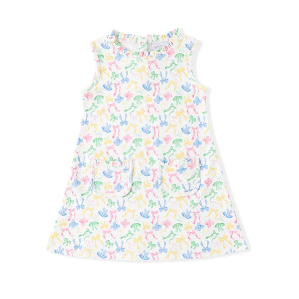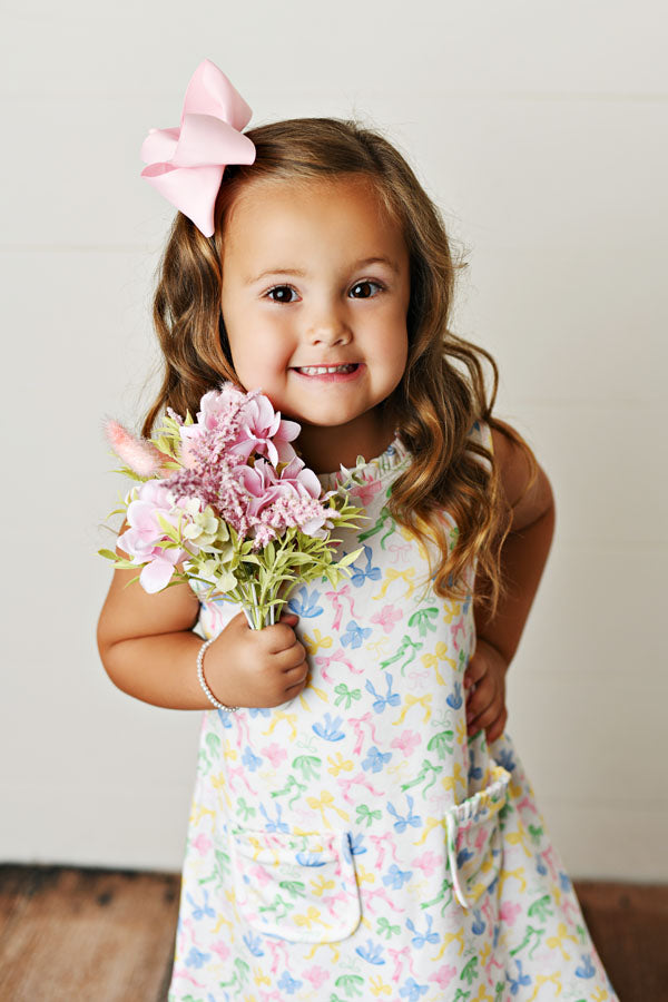 An adorable choice for Easter or church on Sunday, this Bow-Tiful pocket dress is both comfortable and so trendy this season! Featuring bows all over, a ruffled neck and functional pockets, your little one will be excited to put this on!