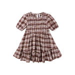 Our India Dress features a smocked bodice, a gathered V-waistline, and a flowing gathered bottom tier.