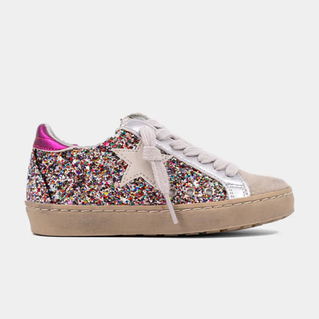 Our MINI styles turn our best-selling sneakers into fun-sized favorites for Kids and Toddlers. The PAULA MINI in Multi dazzles with a glittery mix of colors, adding a playful sparkle to every step. Featuring a sturdy sole and rounded toe for comfort, it's perfect for little trendsetters.