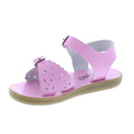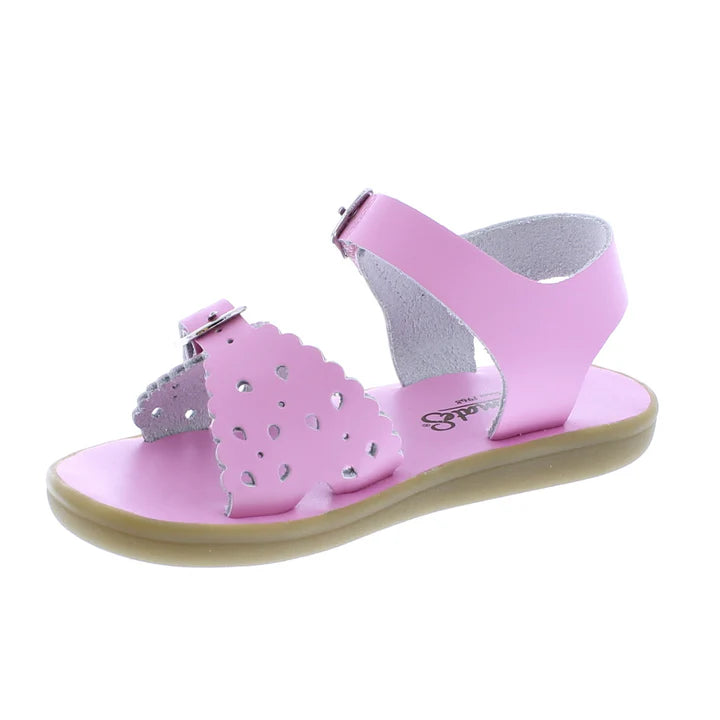 Open-toe, open-heel leather sandal featuring true-buckle forefoot strap with decorative tear-drop perf design and hook-and-loop ankle strap with decorative buckle.