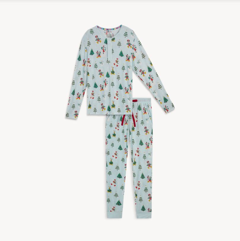 Match your littles this Christmas!! This men's pajama set features an all over Mickey & Friends print, drawstring waistband, and magnetic closures along the neckline.