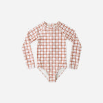 Rylee + Cru Delphine Rashguard One Piece in Cherry Check offers girls swimwear style, sun coverage, and boutique summer beach appeal versatile versatile spring.